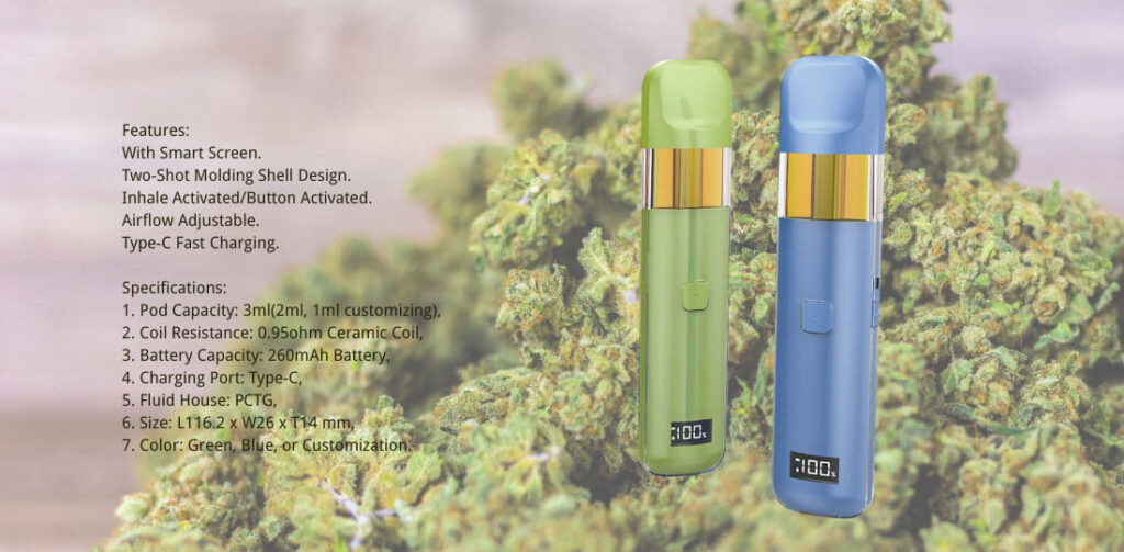 One of the key highlights of this device is its smart screen display, which clearly shows battery level and usage information. This improves user experience and gives the product a more premium and modern feel in the competitive cannabis vape market. In addition, the device supports both inhale activation and button activation, allowing users to choose their preferred vaping style.