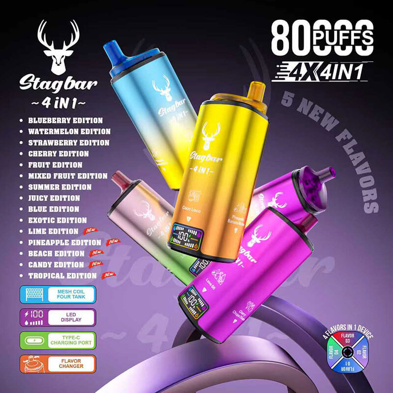Discover the STAGBAR 4 in 1 Disposable Vape, the ultimate choice for wholesalers and distributors looking for high-capacity, multi-flavor convenience. Designed for long-lasting satisfaction, this innovative device offers 80,000 puffs with four separate flavor pods in one unit, giving your customers a versatile vaping experience.
