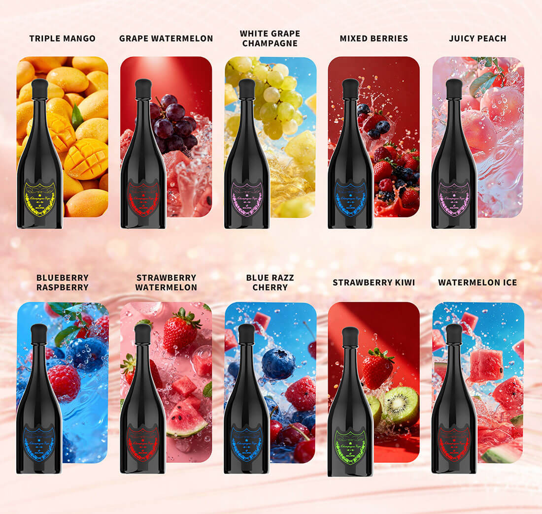 Each unit comes prefilled with 20ml of 2% nicotine e-liquid, available in ten popular flavors such as Watermelon Ice, Mixed Berries, Triple Mango, Grape Watermelon, and the signature White Grape Champagne. This wide flavor selection helps distributors cover different customer preferences and boost repeat orders.