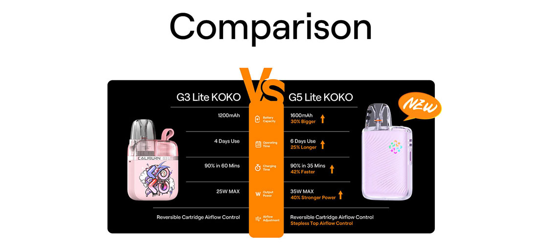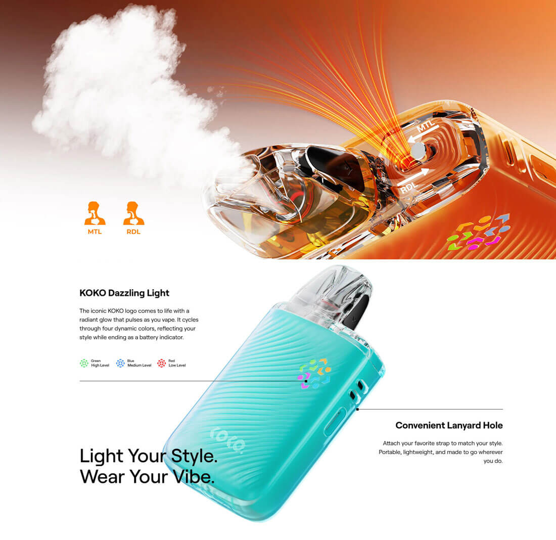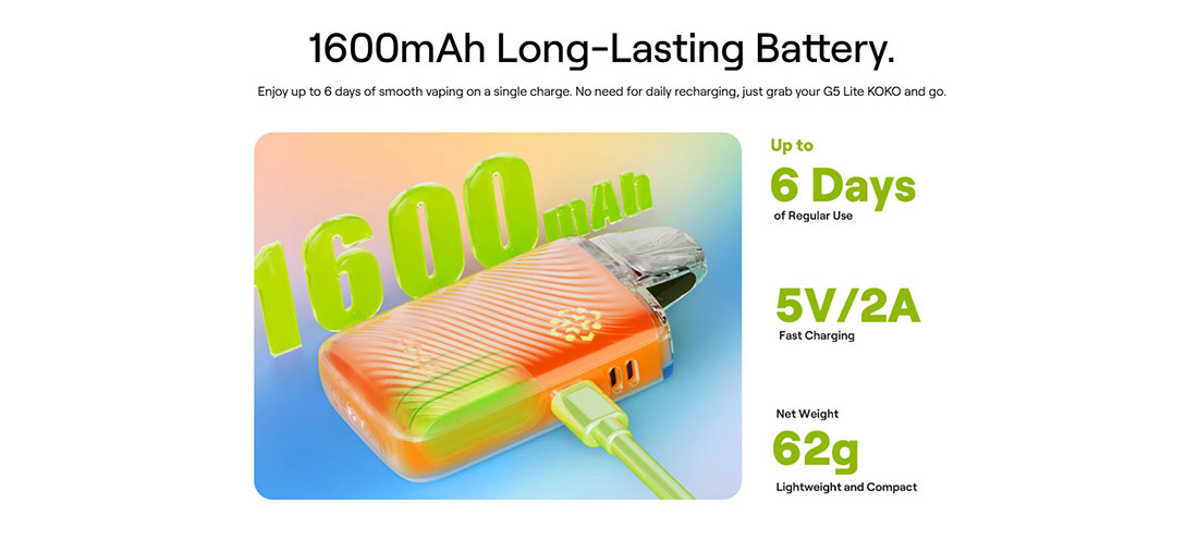 Powered by a built-in 1600mAh battery with a max output of 35W, the Caliburn G5 LITE Koko delivers stable performance that can last up to 6 days of smooth vaping on a single charge. The KOKO dazzling light battery indicator clearly shows power status at a glance, helping end users manage daily usage easily. With Type-C fast charging (5V/2A), downtime is kept to a minimum.