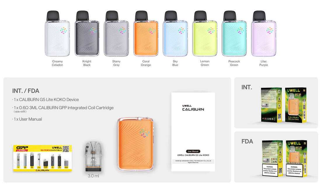 Uwell Caliburn G5 LITE Koko e-Cigarette Kit is a compact yet powerful pod system designed for distributors and wholesalers looking to expand their pod vape lineup with a reliable, fast-moving product. Blending modern style with practical performance, this device features eye-catching colors and a comfortable grip, making it attractive for both new and experienced vapers in retail markets.