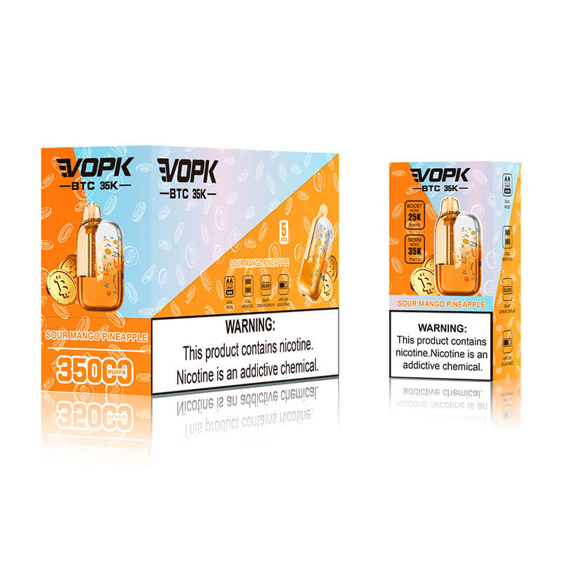 The VOPK BTC 35K Puffs Disposable Vape with Full Display features a smart e-liquid and battery screen, dual mesh coil technology, and dual vaping modes for flexible performance. With 22ml capacity, 850mAh rechargeable battery, airflow control, and Type-C fast charging, it delivers up to 35,000 puffs. A strong wholesale option for distributors seeking a high-capacity, retail-ready disposable vape.
